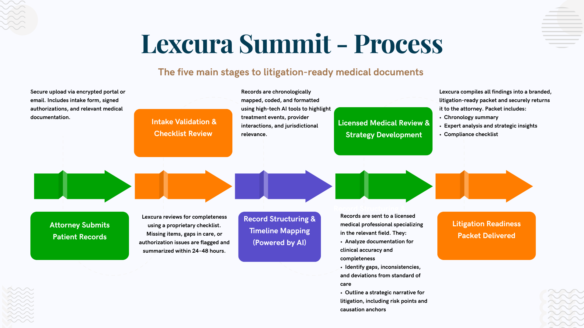At Lexcura Summit, our process is engineered for speed, accuracy, and litigation-ready clarity. Every case we handle follows a standardized, HIPAA-compliant workflow supported by advanced AI technology and the clinical expertise of more than 200 licensed clinicians nationwide. From secure document intake to final attorney-ready reports, our streamlined approach ensures you receive precise medical-legal insights on time—every time.
